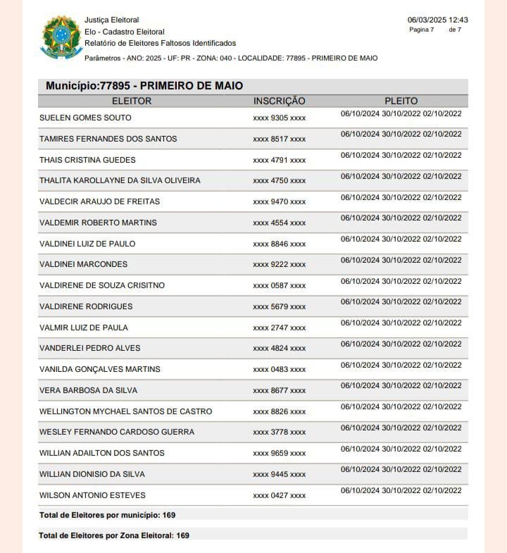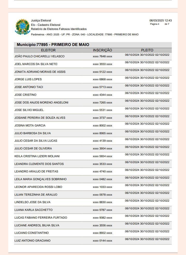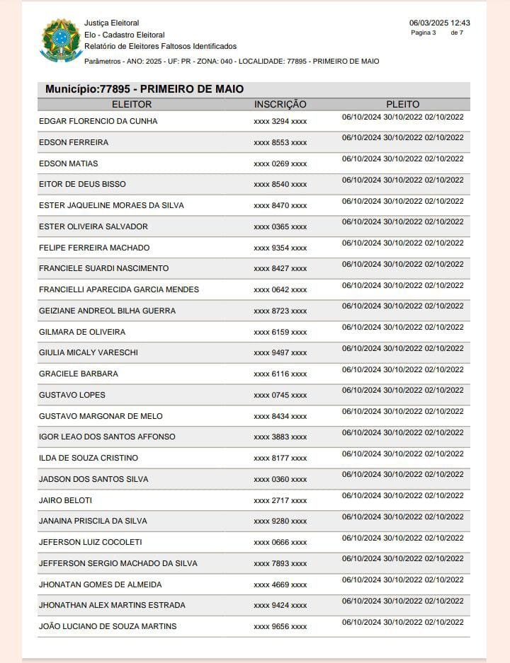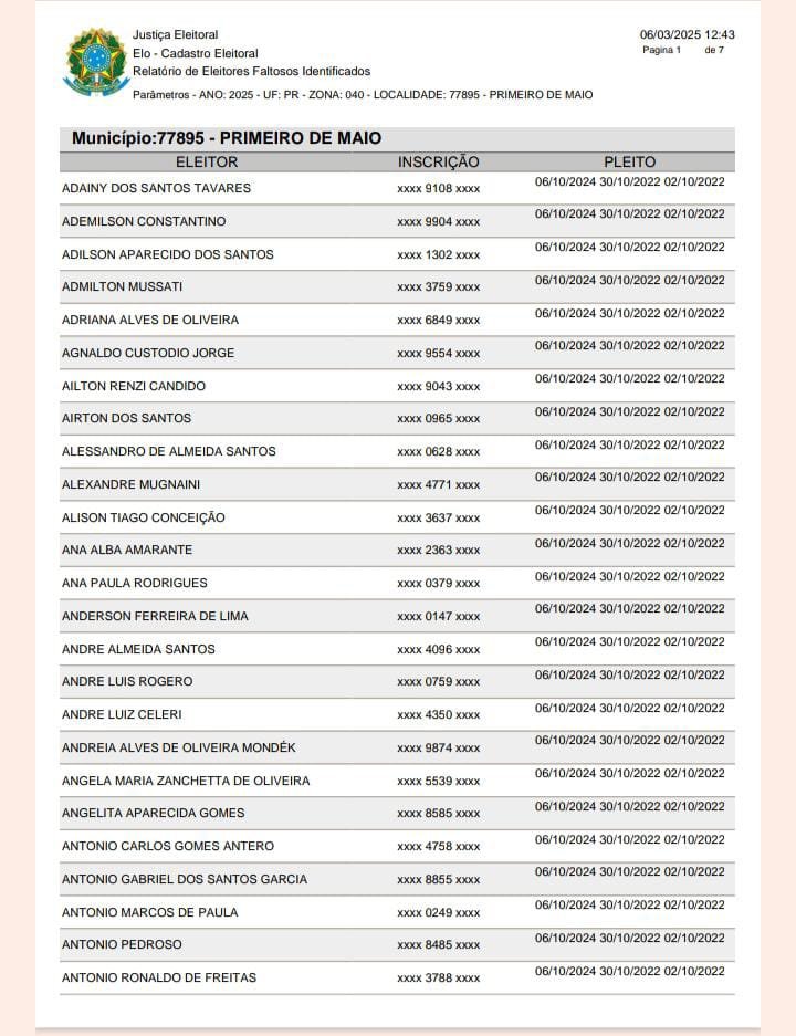 O Excelentíssimo Senhor Doutor Julio Farah Neto, Juiz da 040ª Zona Eleitoral do Município de Sertanópolis, Estado do Paraná, anunciou o cancelamento das inscrições eleitorais dos eleitores em Primeiro de Maio que deixaram de votar nas três últimas eleições consecutivas. A relação dos eleitores faltosos ficará disponível no cartório eleitoral para consulta.